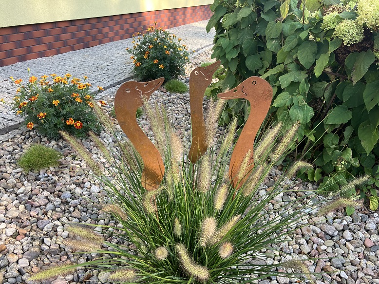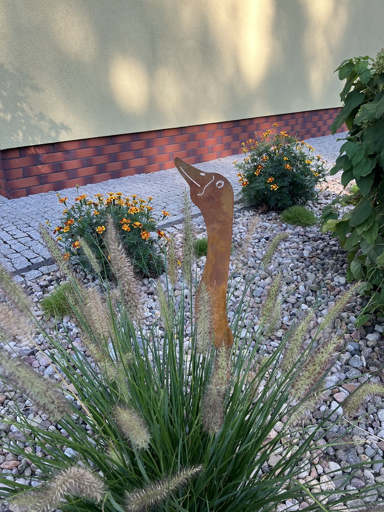 Gęś, a właściwie szyja gęsi to ciekawa dekoracja, która idealnie pasuje do roślin o średniej wysokości. Urokliwie prezentują się w zestawie kilku sztuk. Ozdoba jest odporna na warunki atmosferyczne może dekorować ogród przez cały rok.