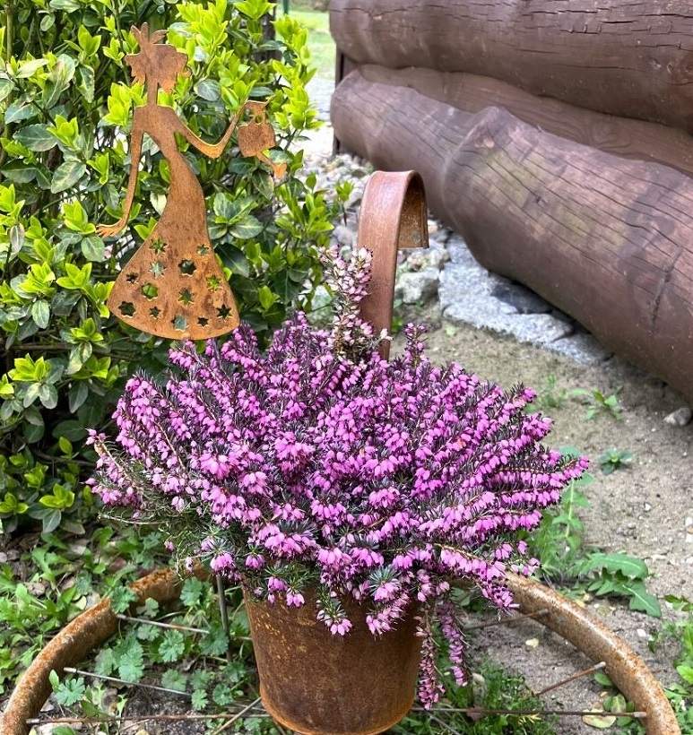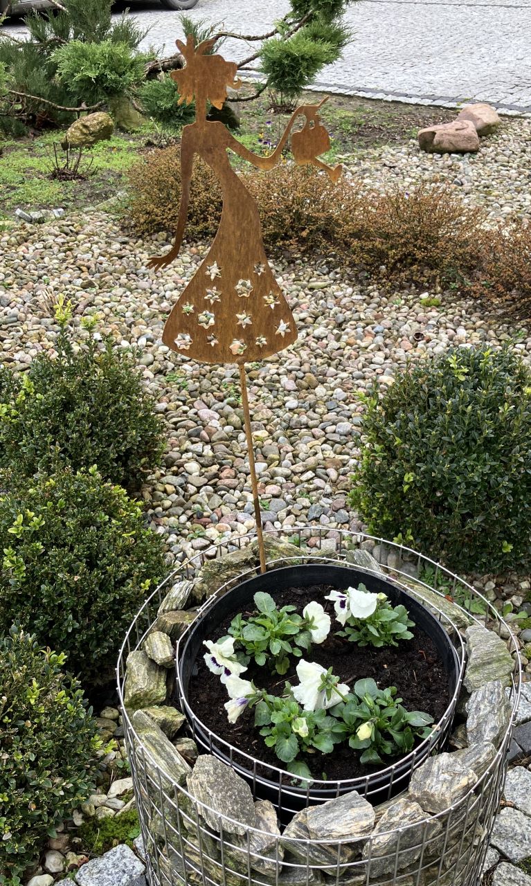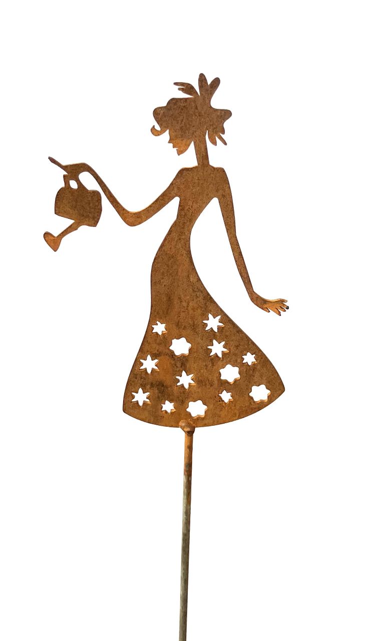 Mini pani z konewką stanowi element dekoracyjny donicy lub wazonu, wraz z roślinami tworzy piękną aranżację. Ozdoba może stanowić całoroczną dekorację ogrodową, gdyż jest odporna na wszelkie warunki atmosferyczne.