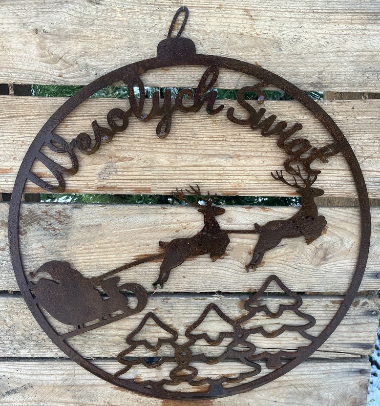 Wianek z Mikołajem i reniferami stanowi świąteczną dekorację tarasu, drzwi czy wnętrza domu. Wianek można ozdobić zielenią, która podkreśli naturalną barwę rudości.