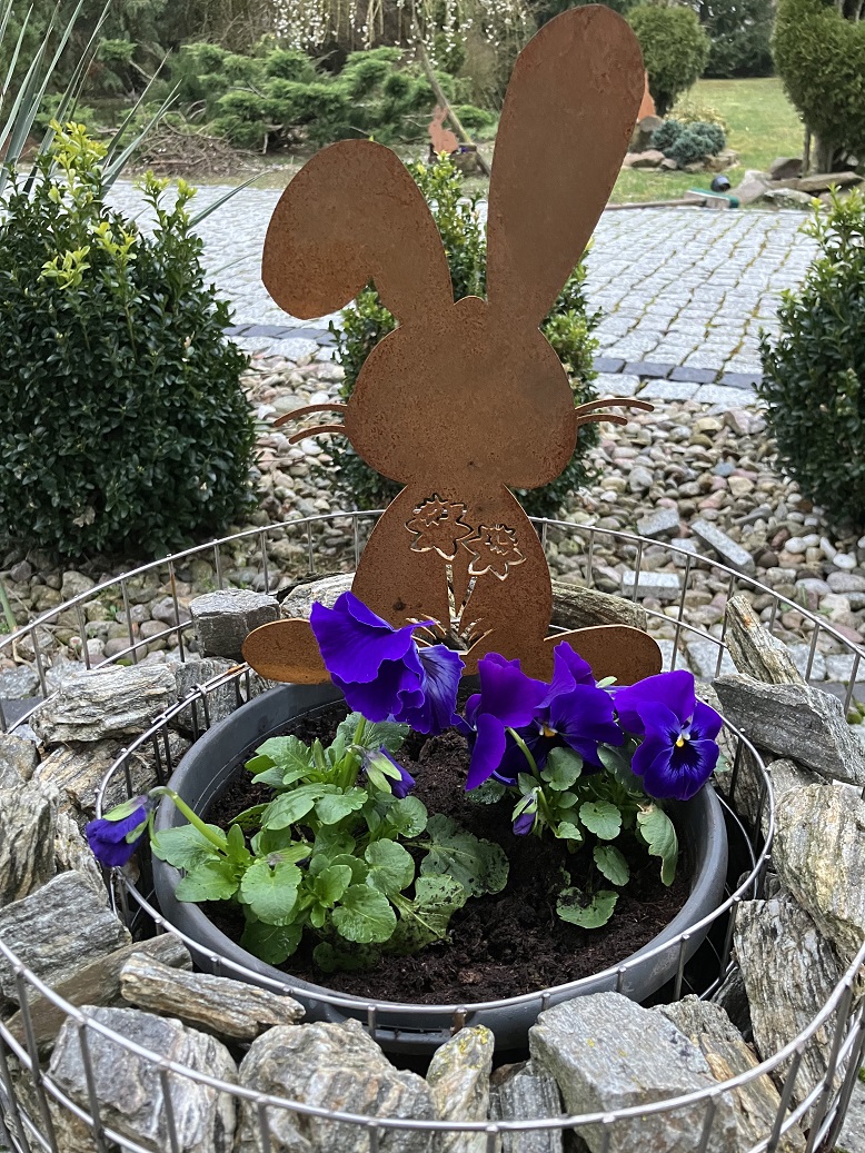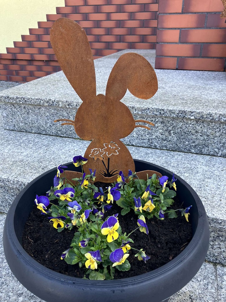 Zając z żonkilami jest ciekawym elementem dekoracyjnym ogrodu w okresie świąt Wielkanocnych. W połączeniu z zielenią ogrodową oraz niskimi krzewami czy roślinami doniczkowymi stworzy ciekawą świąteczną kompozycję. Produkt nadaje się do ekspozycji w ogrodzie lub tarasie, gdyż jest odporny na wszelkie warunki atmosferyczne.